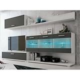 - El set de muebles de comedor o salón Gitta se compone de un bajo con dos puertas y espacios para tus enseres y periféricos, un bodeguero con puerta y estantes para exhibir tus objetos favoritos, una vitrina colgada que combina puerta opaca y cristal, y lo mejor de todo: ¡luces LED originales en su interior! Además, incluye una estantería colgante para pared