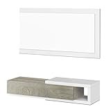 - La pieza superior consistente en un espejo rectangular con marco blanco, el módulo inferior está formado por un cajón y una pequeña superficie útil lateral, ideal para situar en ella algún objeto decorativo.
