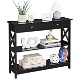 - Espacioso: Una mesa de consola voluminosa. Su bandeja larga puede acomodar jarrón, teléfono o marco de fotos. Su gran cajón de 2 asas contiene sus pequeños artículos como llaves y gafas. Sus estantes de 2 niveles te ayudan a clasificar objetos como zapatos.