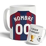 - Taza personalizada de fútbol: diseño original y personalizado de la camiseta de tu equipo de fútbol favorito. En esta taza podrás personalizar tanto el nombre como el número. ¡Visca el Barça!